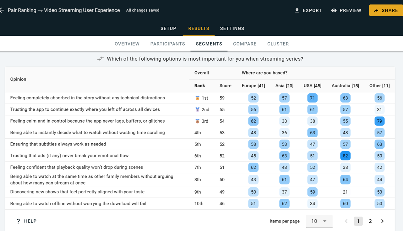 Once you've collected results, OpinionX's segmentation features allow you to filter, compare, and map differences between groups — such as free users vs. paying customers, or one region vs. another. This kind of analysis is invaluable for product and research teams making prioritization decisions backed by real data.